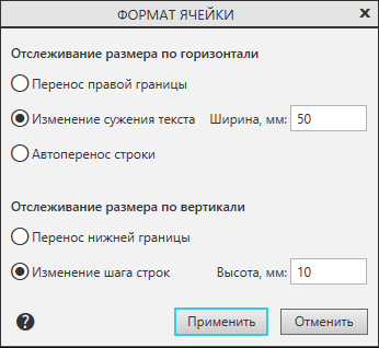 Позволяет задать высоту строки и ширину столбца, содержащих выбранную ячейку, а также вариант «поведения» таблицы при вводе текста в эту ячейку. Если выделен диапазон ячеек, то ввод высоты строки и ширины столбца невозможен.