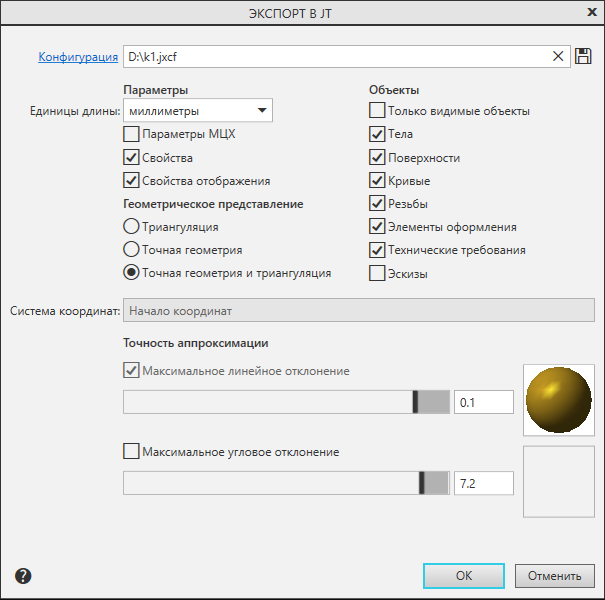 Группа опций позволяет задать параметры аппроксимации. Присутствует в диалоге при включенной опции Триангуляция или Точная геометрия и триангуляция в группе Геометрическое представление. |