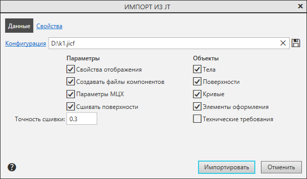 Диалог появляется на экране после вызова команды Открыть с параметрами из меню кнопки Открыть при импорте модели из файла формата JT. Позволяет настроить параметры импорта.