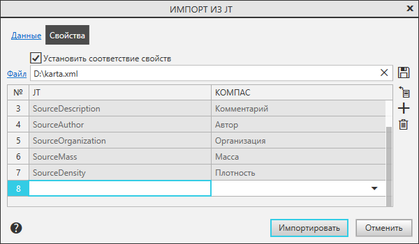 При импорте файла формата JT производится чтение записанных в нем атрибутов. Предопределенные атрибуты SourseID, SourseName, SourseDescription, SourseAuthor, SourseOrganization, SourseMass и SourseDensity преобразуются в свойства Обозначение, Наименование, Комментарий, Автор, Организация, Масса и Плотность соответственно, а остальные атрибуты — в пользовательские свойства, автоматически создаваемые в модели. При необходимости можно установить соответствие атрибутов и свойств документа КОМПАС-3D.