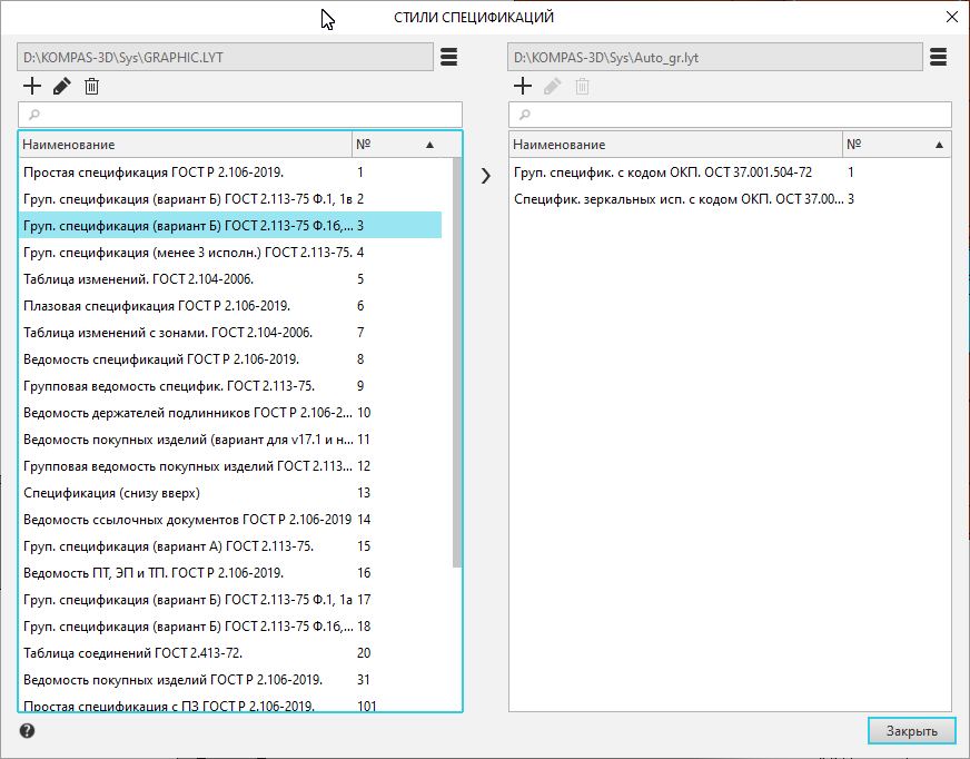 Диалог имеет два окна просмотра, в которых можно отобразить списки стилей спецификаций, хранящихся в двух разных библиотеках. Активным может быть только одно окно. Для активизации нужного окна щелкните по нему левой кнопкой мыши. Признаком того, что окно активно, является отображение рамки вокруг него.