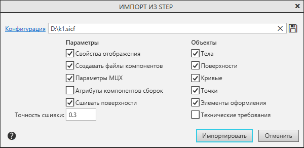 Для записи в файл конфигурации настроек импорта, выполненных в данном диалоге, нажмите эту кнопку. Файл конфигурации импорта в формат STEP (для всех вариантов) имеет расширение sikf. |