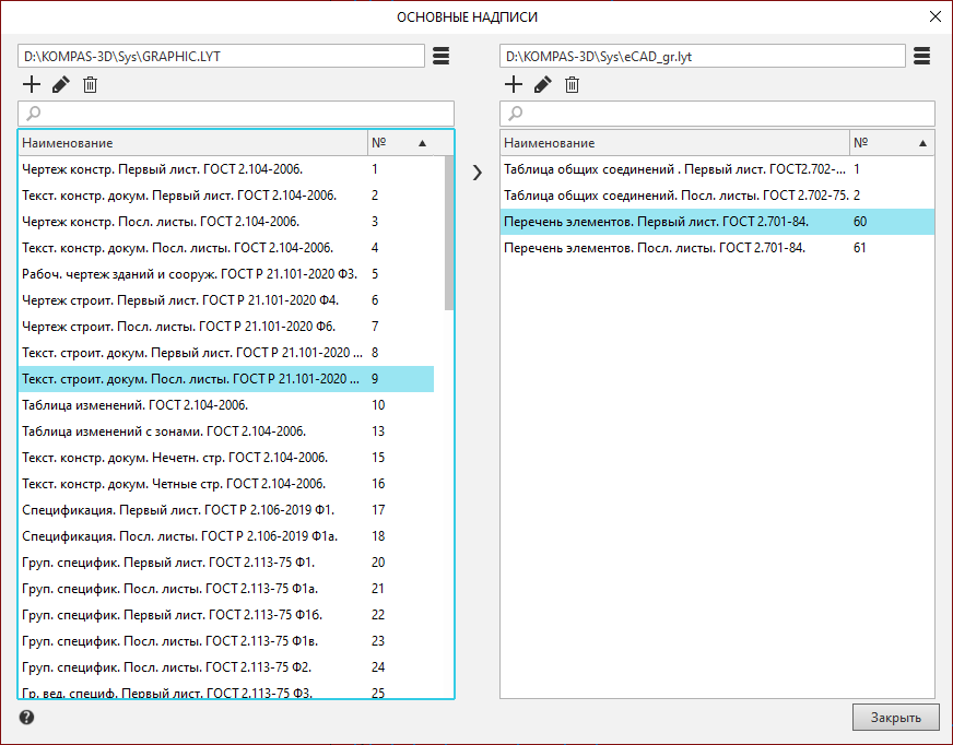 Диалог имеет два окна просмотра, в которых можно отобразить списки основных надписей, хранящихся в двух разных библиотеках. Активным может быть только одно окно. Для активизации нужного окна щелкните по нему левой кнопкой мыши. Признаком того, что окно активно, является отображение рамки вокруг него.