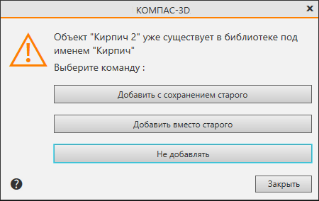 Отказ от помещения объекта в библиотеку. Отказ от помещения в библиотеку вновь созданного объекта означает потерю всех сделанных настроек. Так как в данном случае помещаемый объект еще не используется ни в одном документе, его целесообразнее добавить с сохранением имеющегося. |