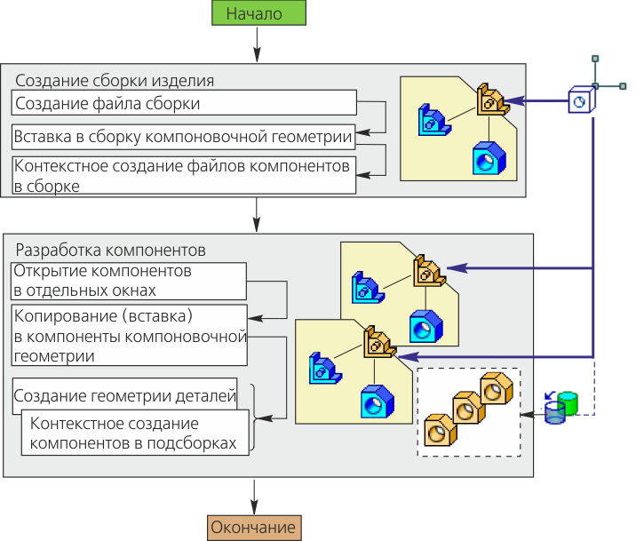 Методика предполагает последовательное, начиная с верхнего и завершая нижними уровнями, создание компонентов в контексте моделей, куда эти компоненты входят. Разработка компонентов после их создания выполняется в отдельных окнах. Построения в деталях опираются на копии объектов компоновочной геометрии, в подсборках — на вставки компоновочной геометрии.