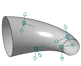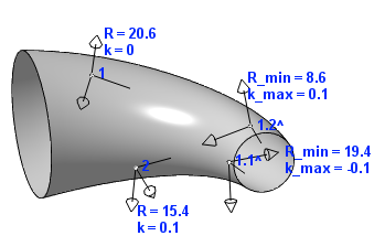 Проверка кривизны предназначена для нахождения точек с минимальным радиусом кривизны (максимальным значением кривизны), а также для определения кривизны в любой точке указанной поверхности. При этом значения кривизны могут быть как положительными (на выпуклых участках), так и отрицательными (на вогнутых участках). В графической области точки, определенные при проверке кривизны, отображаются в виде численных значений с векторами нормалей и главных направлений кривизны.