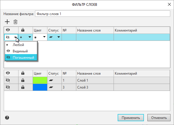 •В верхнем окне в виде таблицы формируется набор условий фильтрации слоев. Таблица содержит столбцы со свойствами — названия свойств находятся в верхней строке таблицы. Следующие строки таблицы служат для задания условий фильтрации. Значения свойств Видимость, Активность, Статус и Цвет выбираются из списка (для цвета — из палитры), который появляется после щелчка мыши по треугольнику в соответствующей ячейке. Для свойств №, Название слоя и Комментарий вводятся символы, являющиеся условием фильтрации.