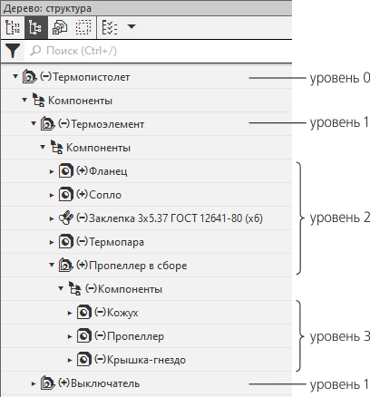 Уровни сборки — уровни вложенности компонентов сборки. Иерархию компонентов сборки можно просмотреть в Дереве этой сборки. На самом верхнем (нулевом) уровне находится сама текущая модель, это — корневой элемент Дерева. Остальные объекты располагаются на следующих уровнях. Компоненты первого уровня — это компоненты, непосредственно вставленные в текущую сборку. Компоненты второго уровня — это компоненты, вставленные в компонент первого уровня, и так далее.