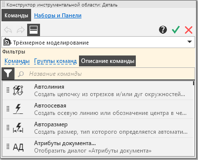 Вкладка Команды содержит список команд системы КОМПАС-3D. Для каждой команды показывается название, краткое описание и пиктограмма (в случае отсутствия пиктограммы вместо нее отображаются первые буквы двух первых слов названия команды).