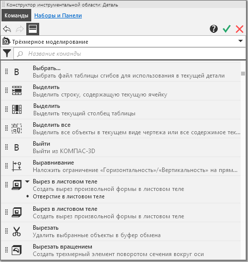 Если команды образуют группу (например, на рисунке — это команды Вырез в листовом теле и Отверстие в листовом теле), то они показываются в списке не только по отдельности, но и в составе своей группы, т.е. список содержит отдельную строку каждой команды и строку объединяющей их группы. В строке группы перечислены все команды этой группы.