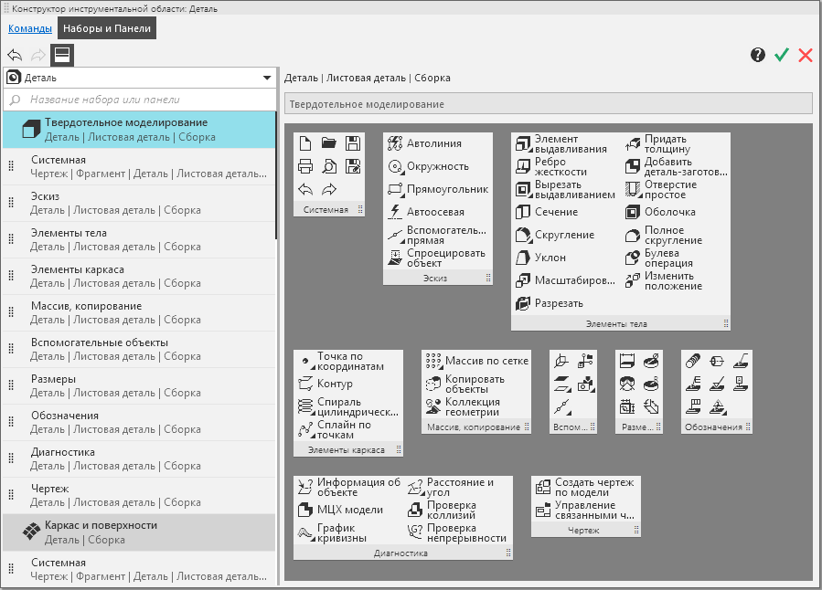 Окно Конструктора содержит две вкладки — Команды и Наборы и Панели. Подробное описание вкладок приведено ниже.