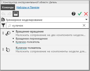 Для быстрого поиска нужного набора или панели на вкладке Конструктора используется строка поиска. Введите в эту строку символы, входящие в название набора/панели. На вкладке останутся только наборы и панели, названия которых содержат эти символы.