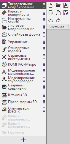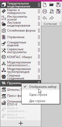 По умолчанию отображение набора включено. При этом рядом с названием команды в меню показывается «галочка». Чтобы отключить отображение набора, вызовите команду Отображать набор из его контекстного меню. «Галочка» рядом с названием команды исчезнет. Строка набора переместится в конец списка, текст и пиктограмма в строке станут серыми. Это означает, что данный набор инструментальных панелей не будет отображаться в Главном окне системы при работе с документами того типа, для которого выполнена настройка.