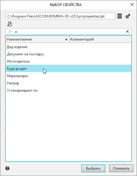 Чтобы подтвердить выбор выделенного в списке свойства, нажмите в диалоге кнопку Выбрать. Если ни одно свойство не выделено, кнопка недоступна. Кроме того, подтвердить выбор и закрыть диалог можно двойным щелчком мыши на строке нужного свойства.