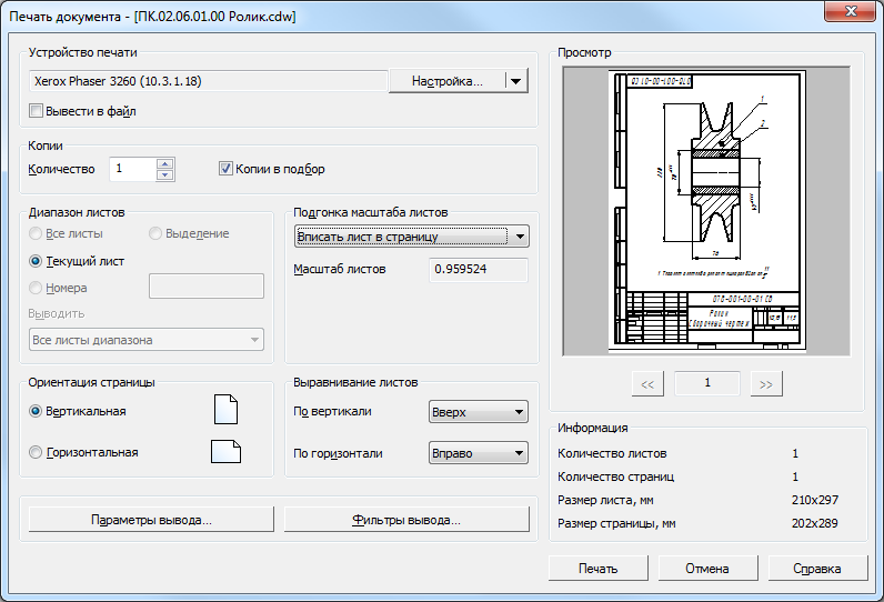 Если перед вызовом диалога печати в чертеже или текстовом документе было что-либо выделено, то автоматически отключается фильтр вывода элементов листа (рамок, основной надписи и т.п.). При необходимости вы можете включить фильтр. В этом случае в текстовом документе будут напечатаны элементы листа целиком, а в чертеже — только те их части, которые попадают в рамку, охватывающую выделенные объекты. |