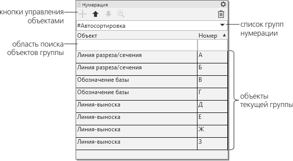 Панель содержит раскрывающийся список групп нумерации, список объектов текущей группы и кнопки, позволяющие изменять параметры и состав групп. Элементы панели доступны, если не запущена ни одна команда.