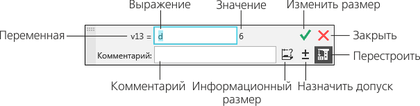 Если при изменении значения размера в поле Выражение вводится выражение или константа, то после завершения работы в диалоге содержимое этого поля заменяется вычисленным значением размера. Данное значение отображается в поле при следующем открытии диалога.