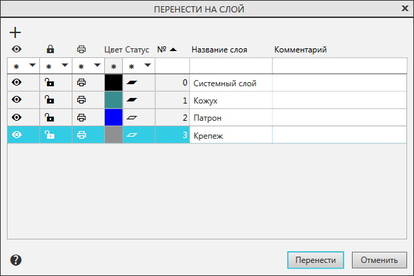 Диалог служит для указания слоя, на который требуется перенести объекты, выделенные в чертеже, фрагменте или эскизе (при работе в чертеже все выделенные объекты должны принадлежать одному виду, не обязательно текущему).