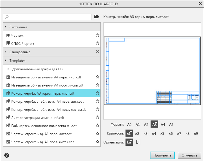 Для создания чертежа по выбранному в списке шаблону нажмите кнопку Применить.