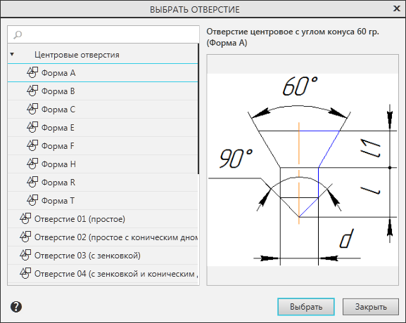 Для выхода из диалога без смены формы отверстия нажмите кнопку Закрыть.