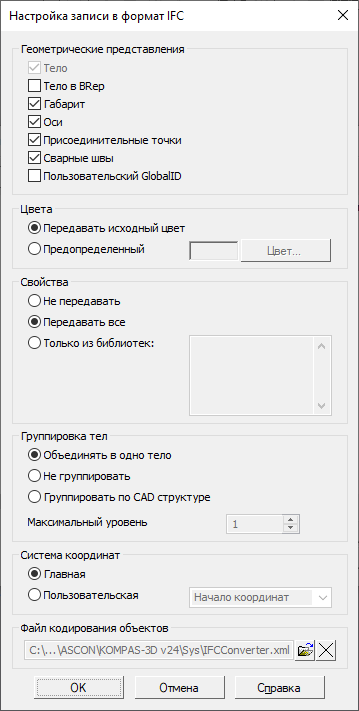 Группа опций позволяет управлять передачей объектов модели. Если опции включены, в файл IFC передаются следующие объекты КОМПАС-3D: •Тело — полигональный объект из исходной модели; •Тело в BRep — объект в граничном представлении из исходной модели; •Габарит — габаритный параллелепипед исходной модели, если выключена опция Тела; •Оси — все оси, построенные в исходной модели; •Присоединительные точки — все присоединительные точки исходной модели. •Сварные швы — сварные швы исходной модели; •Пользовательский GlobalId — глобальный уникальный идентификатор исходной модели. Структура получаемых объектов в файле IFC зависит от настроек элемента Группировка тел. |