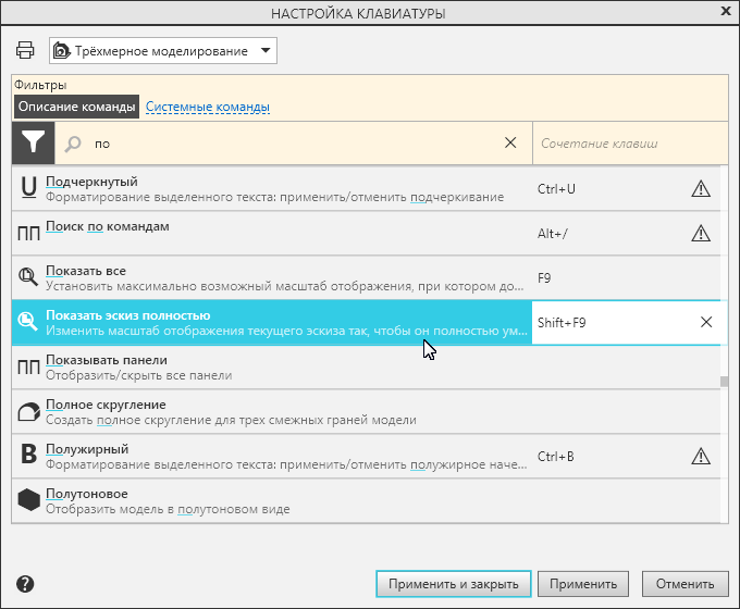 Строка поиска позволяет быстро найти нужную команду по ее названию или по назначенному команде сочетанию клавиш. Символы, входящие в название, вводятся в левую часть строки, а сочетание клавиш — в правую. Если требуется найти команду по ее описанию, нажмите кнопку Фильтры При необходимости можно оставить в списке только команды, клавиатурные комбинации которых нельзя изменить. Для этого при нажатой кнопке Фильтры выберите вариант Системные команды. В списке системных команд также доступен поиск по названию, описанию или сочетанию клавиш. Обратите внимание на то, что фильтрация и поиск команд производятся в списке, ограниченном выбранной областью применения. |