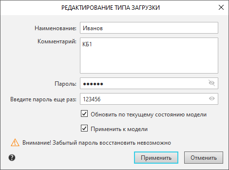 При включенной опции создаваемый/редактируемый тип загрузки будет применен к модели. Если опция выключена, то примененным типом загрузки остается тот же, что и до создания/редактирования. |