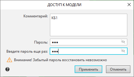 Пароль, если он задан, будет запрашиваться каждый раз при загрузке файла модели.