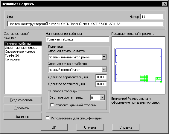 Диалог позволяет создать новую или отредактировать уже существующую основную надпись (штамп) для оформления документов. Штамп создается как набор обычных таблиц, для которых установлены правила размещения на листе.