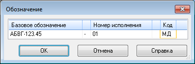 Диалог может содержать следующие поля ввода частей обозначения: Базовое обозначение, Номер исполнения, Дополнительный номер исполнения и Код. Набор полей зависит от того, для какого документа или объекта вызывается диалог.