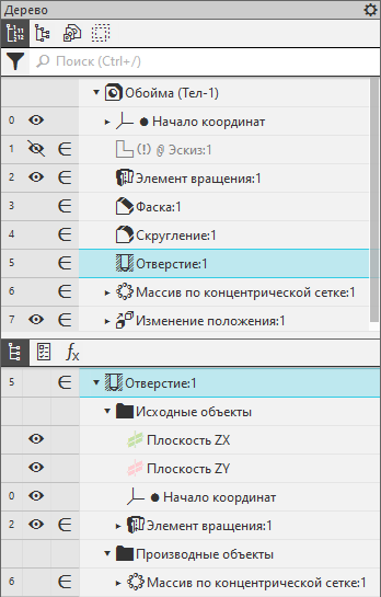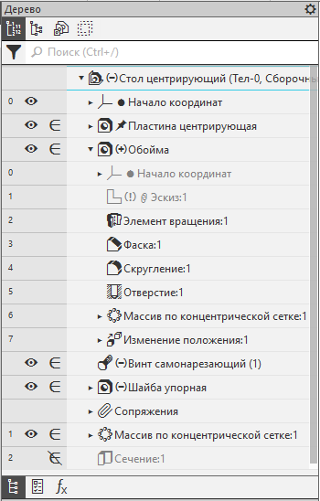 Пример нумерации объектов приведен ниже. На рисунке а) отображаются порядковые номера объектов детали Обойма, а на рисунке б) — сборки Стол центрирующий. В сборке пронумерованы объекты, созданные непосредственно в ней. Начало координат сборки имеет номер 0, Массив по концентрической сетке:1 и Сечение:1 — номера 1 и 2. Объекты компонента Обойма имеют и сохраняют собственную нумерацию.
