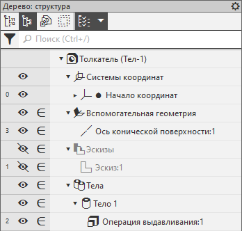 В Дереве построения модели ряду объектов присваиваются номера. Нумеруются операции, эскизы, массивы, макроэлементы, копии геометрии, контекстные связи (подчиненные объекты — экземпляры массивов, вершины сплайнов и т. п. — номеров не имеют).