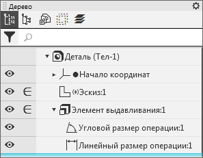 Размеры эскизов и операций можно отобразить в виде элементов оформления. В результате в графической области появятся производные размеры, соответствующие размерам эскизов и операций. В Дереве построения производные размеры отображаются подчиненными эскизам и операциям.