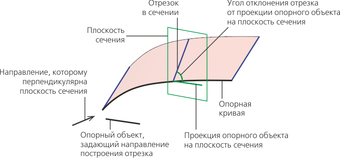 Линейчатая поверхность по кривой и направлению образуется движением отрезка по выбранной кривой, при котором начальная вершина отрезка лежит на кривой, а конечная смещается в плоскости сечения так, чтобы отрезок образовывал заданный угол с проекцией на эту плоскость указанного прямолинейного объекта. Угол между отрезком и спроецированным объектом, а также длина отрезка могут быть постоянными или меняться по заданному закону. Плоскость сечения в каждом своем положении перпендикулярна заданному прямолинейному направлению или кривой линии.