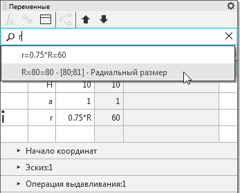 При работе с моделями можно найти на Панели переменных объект, выделенный в Дереве построения. Для этого служит команда Показать в дереве переменных, находящаяся в контекстном меню выделенного объекта. После ее вызова происходит переход к Панели переменных. На Панели выделяется и раскрывается раздел, соответствующий выбранному объекту, при необходимости Панель прокручивается. |