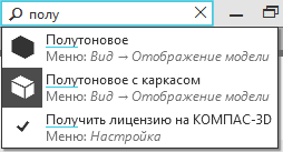 Поиск ведется среди команд, доступных при работе с документом текущего типа в текущем режиме (т.е. среди команд тех пунктов меню, которые отображаются в строке Главного меню в текущий момент). Например, результатом поиска по слову «линия» будут: