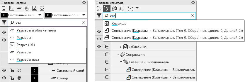 Поиск в Дереве чертежа и в Дереве модели