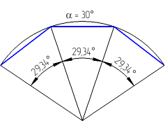 Сегментация представляет собой замену криволинейных участков контура обечайки аппроксимирующими ломаными, состоящими из сегментов равной длины. В вершинах ломаных создаются сгибы заданного радиуса. В результате сгиб, соответствующий дуге в эскизе, заменяется набором сгибов. Пример сегментации обечайки показан на рисунке.