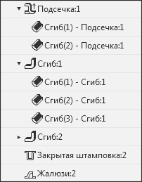 Пиктограммы сгибов расположены в Дереве построения модели на ветвях своих исходных объектов — тех листовых элементов, в состав которых они входят (см. рисунок).