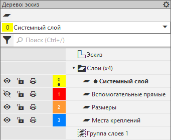 Панель слоев эскиза похожа на Дерево фрагмента (отличаются инструментальные области) и содержит строки с именами слоев и групп слоев эскиза. Действия со слоями на Панели слоев эскиза аналогичны действиям при работе со слоями в графическом документе и подробно описаны в разделе Слои. На Панели слоев эскиза доступны следующие действия: