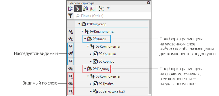 Видимость компонентов при разных способах размещения подсборки на слоях