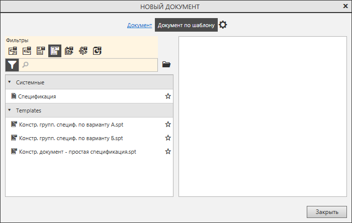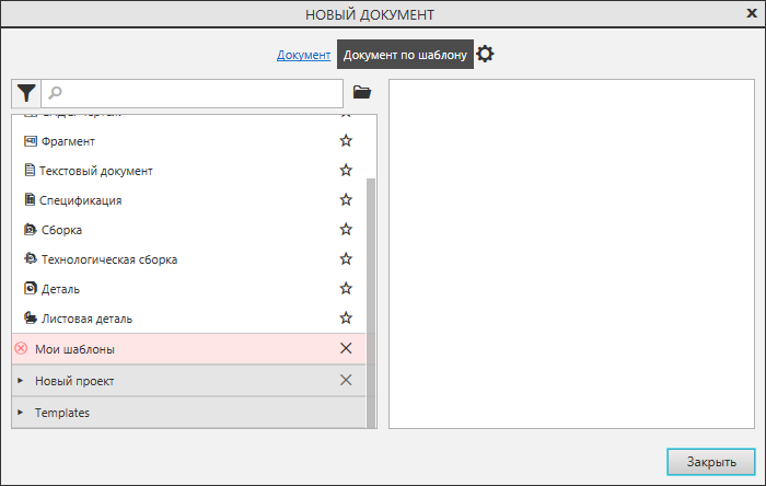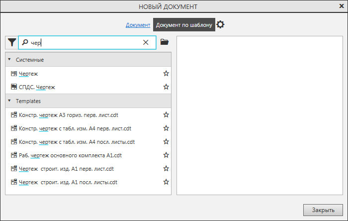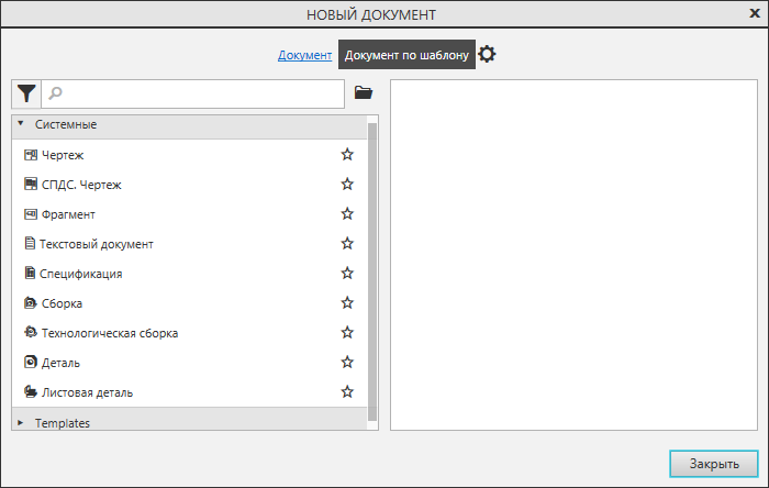 Шаблоны документов в списке сгруппированы в разделы. Раздел Системные содержит шаблоны для новых документов всех типов (чертеж, деталь и т.д.). При выборе шаблонов из этого раздела создаются документы с теми же параметрами, как документы, создаваемые с помощью ярлыков на Стартовой странице и в диалоге Новый документ, команд из меню кнопки вызова Стартовой страницы