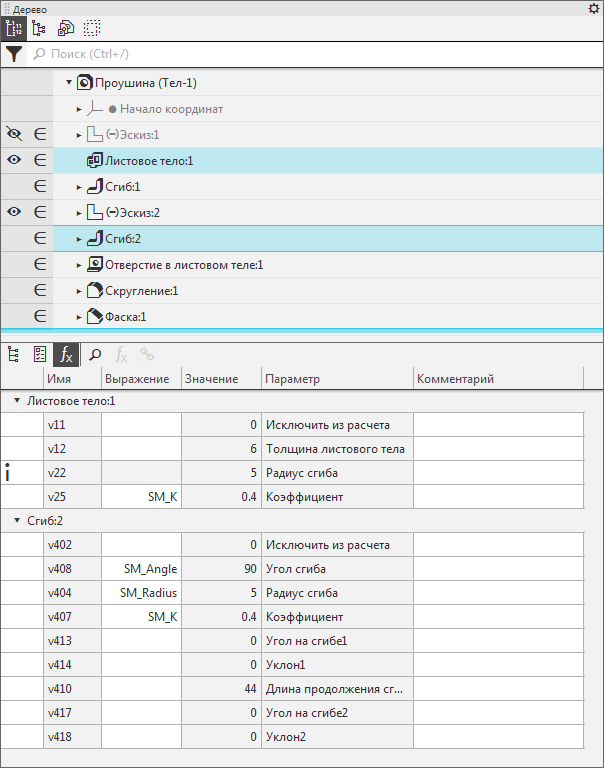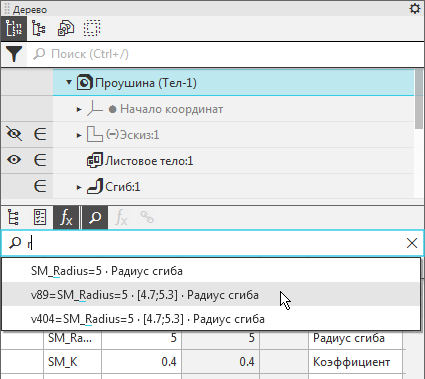 Работа с переменными доступна при отображении Дерева в виде истории построения и в виде структуры модели.