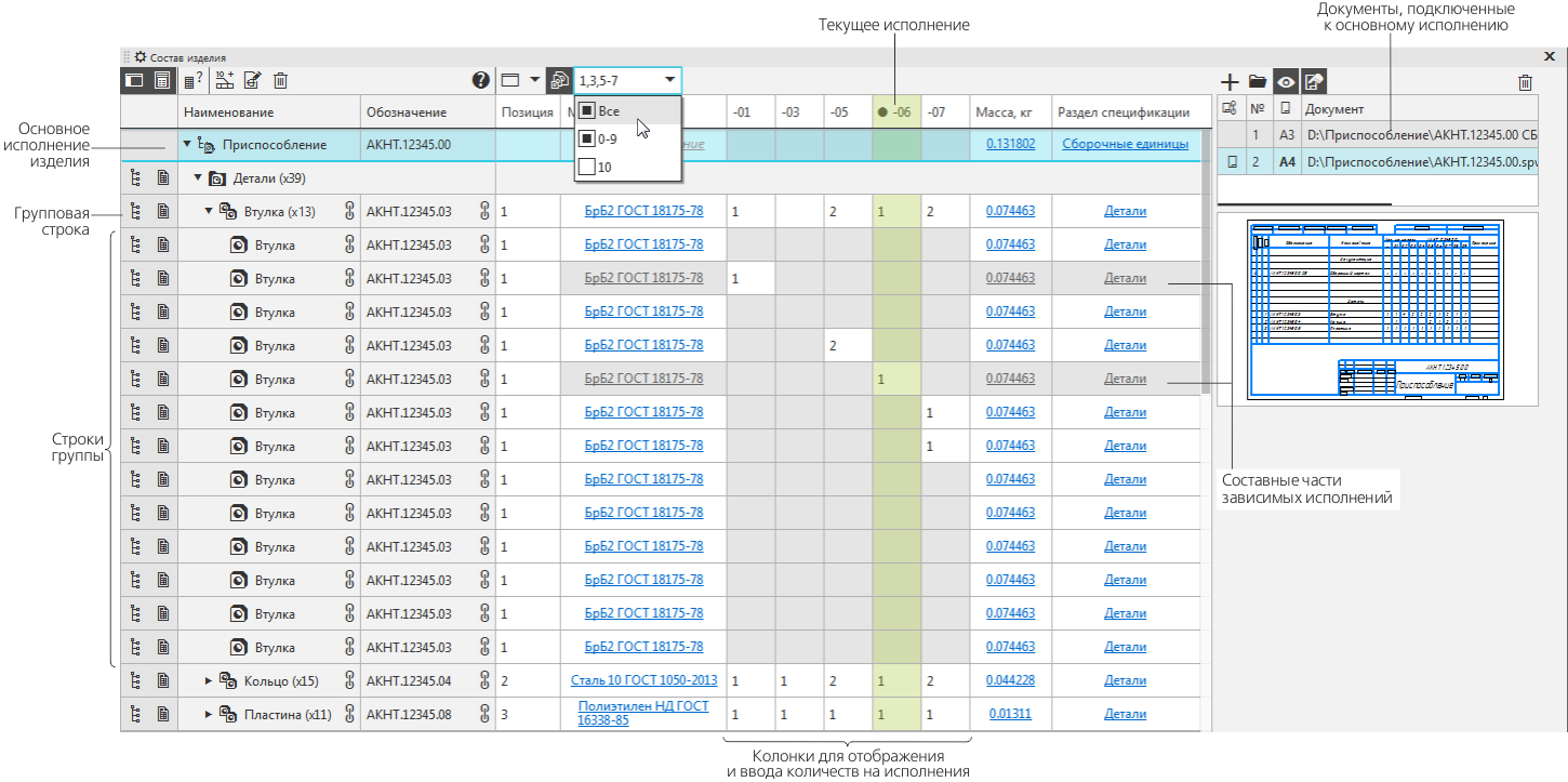 •Колонка Количество разделяется на несколько колонок — для отображения количеств составных частей в разных исполнениях. В заголовках колонок показываются номера исполнений (если номер исполнения не задан, то отображается базовая часть обозначения).