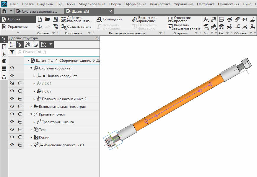 1.При работе со сборкой появилась возможность изменения формы компонентов по месту размещения, т.е. без модификации файлов-источников. Изменение выполняется с помощью операции Деформация, в процессе которой можно отредактировать выполненные в компоненте операции (выдавливания, вращения, по сечениям, по траектории, трубчатый элемент, а также операции построения кривых некоторых типов), заменив их опорные объекты новыми — построенными в сборке или в других компонентах. Для сплайнов и ломаных можно отредактировать координаты вершин; числовые параметры других операций недоступны для изменения.