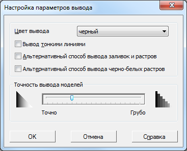 Диалог дополнительных настроек позволяет включить печать изображения тонкими линиями, использовать альтернативные способы вывода заливок и растров, выбрать вариант использования цветов при печати, задать точность печати.
