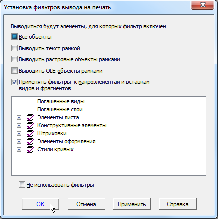 Иногда требуется вывести документ таким образом, чтобы некоторые объекты оформления или некоторые графические объекты не были напечатаны. Для этого используются фильтры. Установка фильтров вывода на печать выполняется в одноименном диалоге (рис. Диалог установки фильтров вывода на печать). Чтобы вызвать этот диалог, нажмите кнопку Фильтры вывода... в диалоге настройки печати документов или специальной печати документов (см. рис. Диалог настройки печати документов и рис. Диалог настройки параметров специальной печати). Установка фильтров вывода, настроенная в диалоге, не изменяет умолчательных настроек системы. Описание элементов управления диалога приведено в разделе Фильтры вывода на печать.