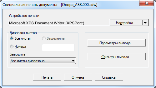 Специальная печать предназначена для вывода текущего документа на печатающие устройства, позволяющие непосредственно в процессе печати менять размеры страницы печати под размер выводимого листа документа. Например, в результате вывода через механизм специальной печати на виртуальный xps-принтер многолистового документа, листы которого имеют разный формат, создается один xps-файл, размеры страниц в котором соответствуют размерам листов в выведенном документе.