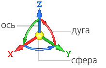Элемент базирования совпадает с текущей системой координат объекта. Элемент состоит из трех объемных осей красного, зеленого и синего цветов, показывающих положительные направления осей X, Y, Z этой системы координат. В плоскостях, перпендикулярных осям, отображаются дуги соответствующего цвета. Например, ось Х, имеет красный цвет. Дуга, лежащая в плоскости, перпендикулярной этой оси, также красного цвета. Стрелка на дуге указывает положительное направление угла поворота. Центральная точка элемента обозначается сферой. Вид элемента базирования приведен на рисунке.