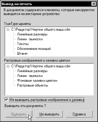 Вы можете отказаться от вывода растровых изображений и заливок, либо указать, выводить или не выводить эти документы, нажав соответствующую кнопку диалога.
